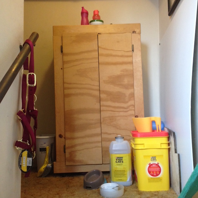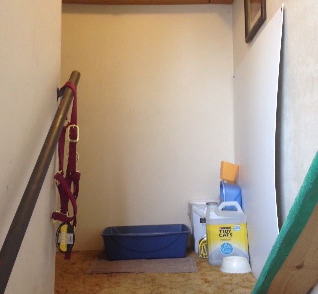 This is the top of the stairway. I’ve been wanting to move that cabinet into the new storage room and I finally did that today too. The litter box was next to the cabinet. Once the cabinet was gone, I moved the litter box over so now there’s more room to get past it. All the cat supplies are nicely in the corner now. It’s so nice to have this all done and it was all done before 1:00 p.m.